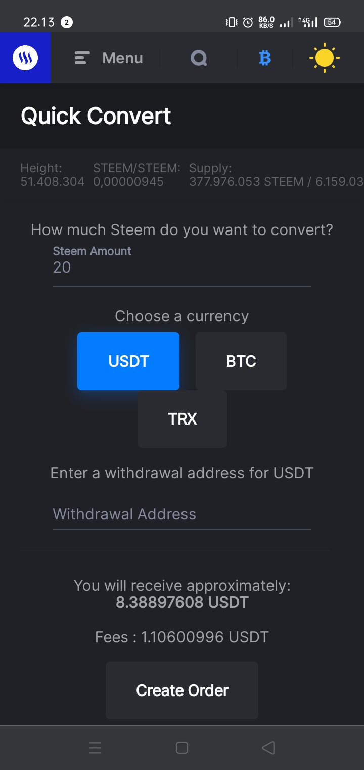- Pilih Crypto yang Anda inginkan yang ingin Anda ubah steem Anda menjadi seperti USDT, BTC atau TRX.