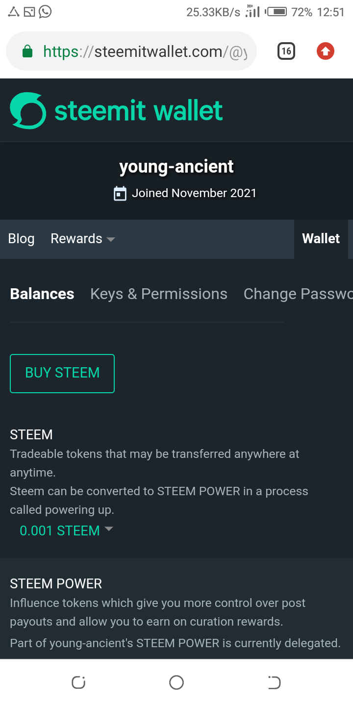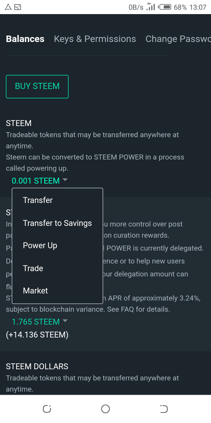 • Click on the down arrow beside Steem and a dialogue box will appear
