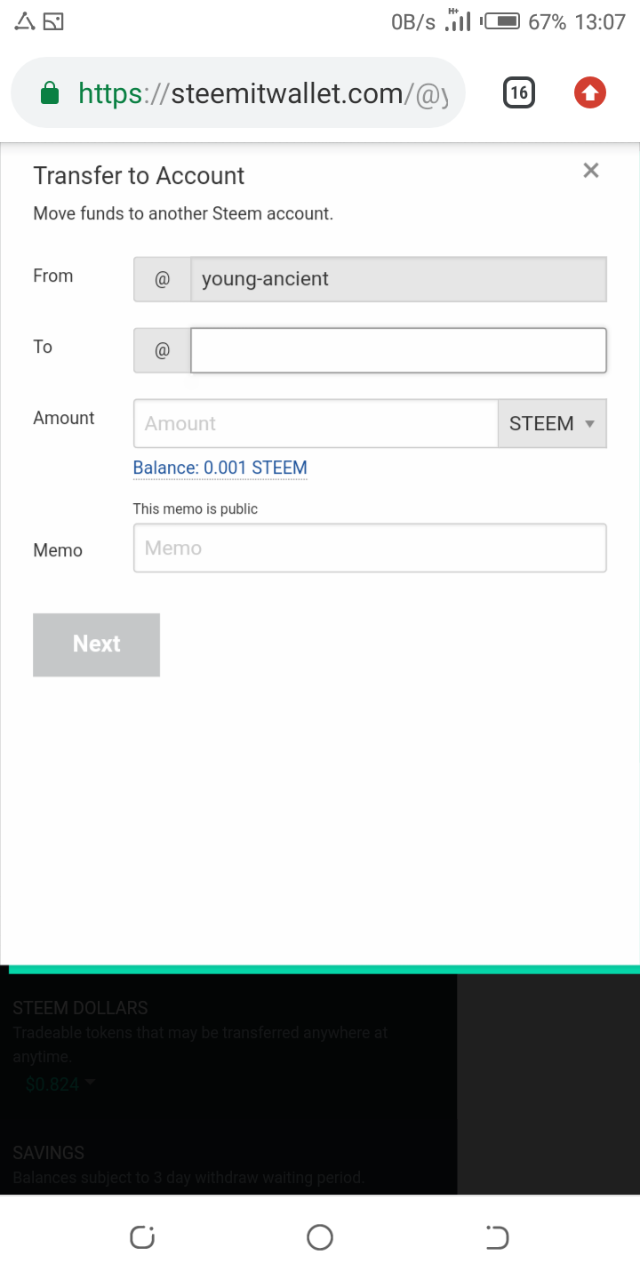 • Enter the Receiver's username and amount of Steem to be transferred.