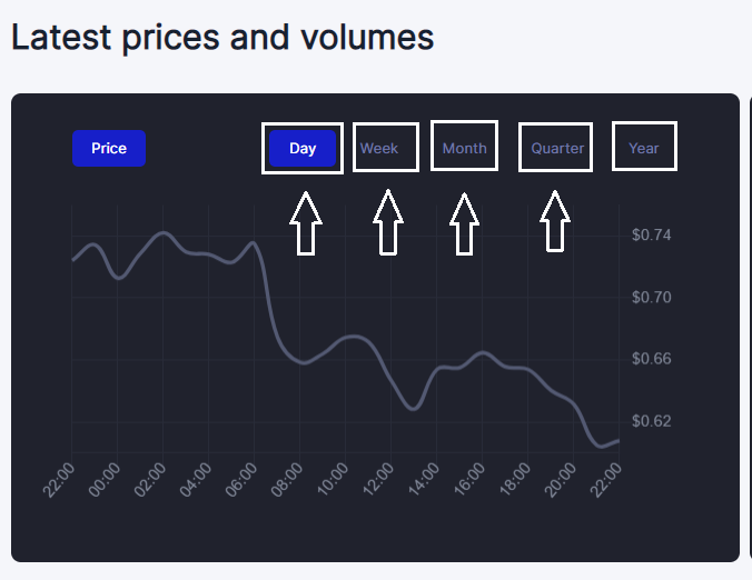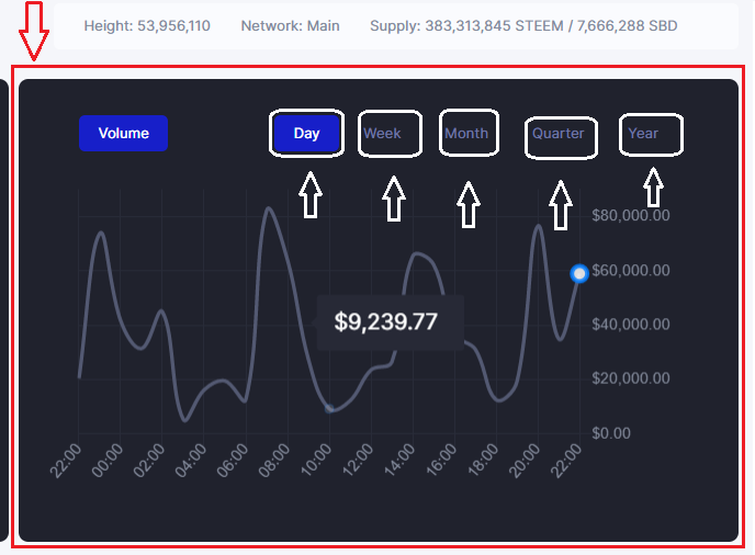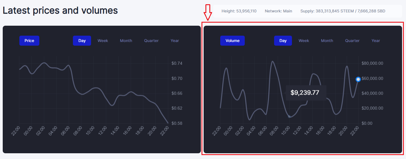 This chart of Volume shows us the last 24 hours graph of volume and there also options to see 1 week, 1 month, 1 quarter and 1 year volume charts.
