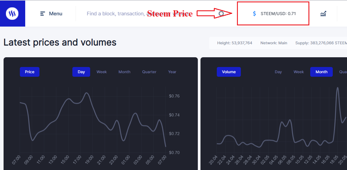 There is a chart in Steemscan under Heading of Latest Steem prices and Volumes which show 1 day, 1 week, 1 month, 1 quarter and 1 year chart of Steem prices.