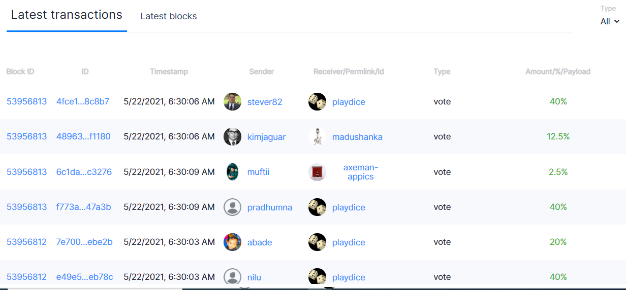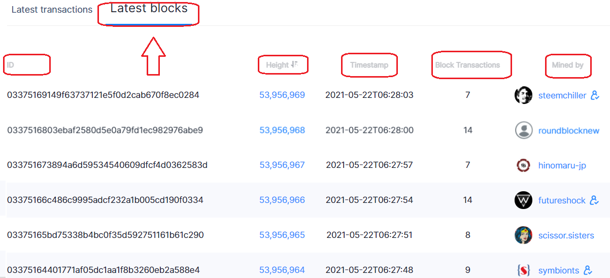 Under Latest Blocks, we can see latest blocks that were mined by witnesses in Steem Blockchain. Details of blocks like blocks Mined by, block ID, Timestamp, block transactions and height are shown under latest blocks.