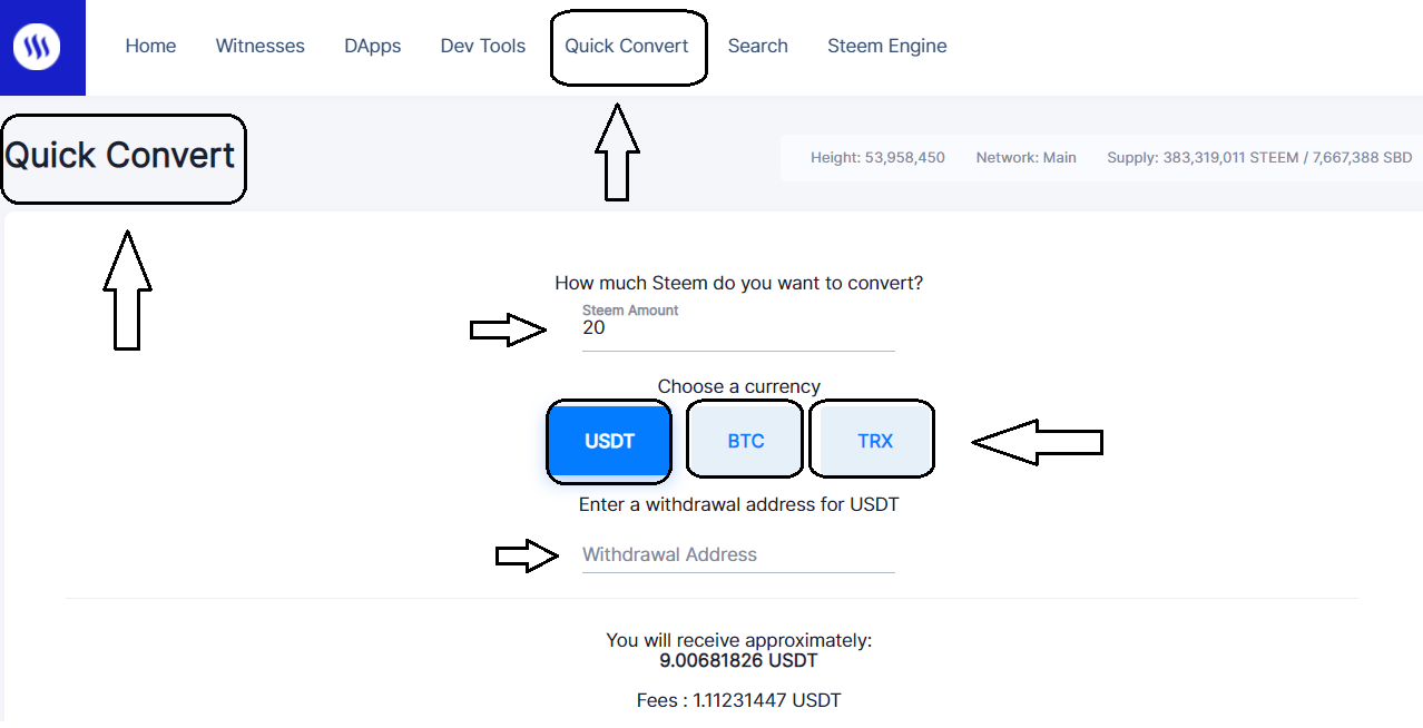 Explain How to use "Quick Convert" and what is the fee charged for different Steem amount for withdrawal?