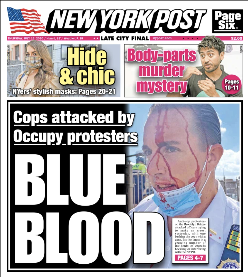 뉴욕에서는 요즘 매일 인종차별 반대시위가 벌어지고 있는데요. 경찰에 대한 적대감정도 큰 편입니다. 15일 브루클린 브릿지에서 시위가 있었는데 시위대가 휘두른 야구방망이에 경찰이 머리를 맞고 피를 흘리는 사진이 뉴욕포스트 1면에 실렸습니다.
