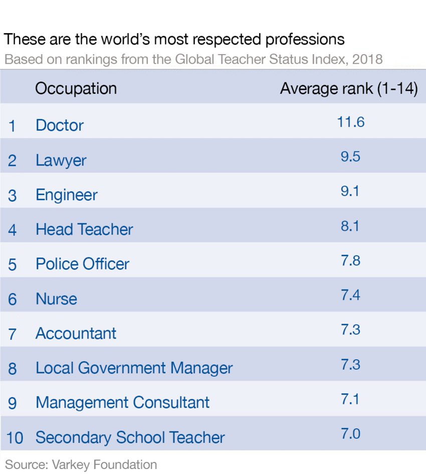 มีรายงานการศึกษาล่าสุดที่ได้ทำการศึกษาใน 35 ประเทศทั่วโลก ทำการศึกษาโดยองค์กรการกุศล Varkey Foundation ได้ทำการสำรวจข้อมูลจำนวน 14 อาชีพหลังจากจบการศึกษา โดยการเก็บข้อมูลเพื่อทำการศึกษาจากกลุ่มตัวอย่างจำนวน 1000 คนในแต่ละประเทศ โดยให้จัดอันดับ 14 อาชีพที่น่านับถือ
