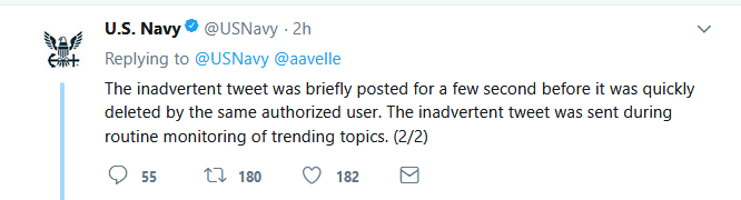 The Navy attempted to explain the embarrassing mistake, citing it as mistake during a "routine monitoring of trending topics":