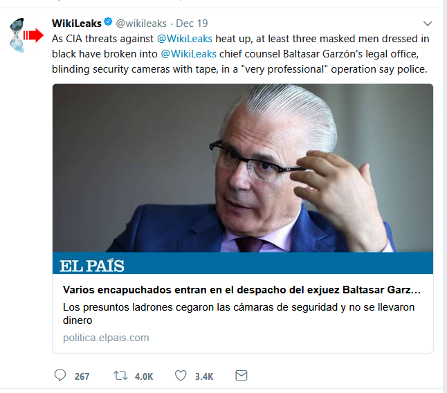 Speculators swarmed Twitter theorizing on what actions might be occurring to threaten Wikileaks, especially after reports on December 19th of a strange event targeting the head of Wikileaks legal team in Madrid. Masked intruders reportedly invaded the office of Baltasar Garzon after covering security cameras with tape and left without taking any money.