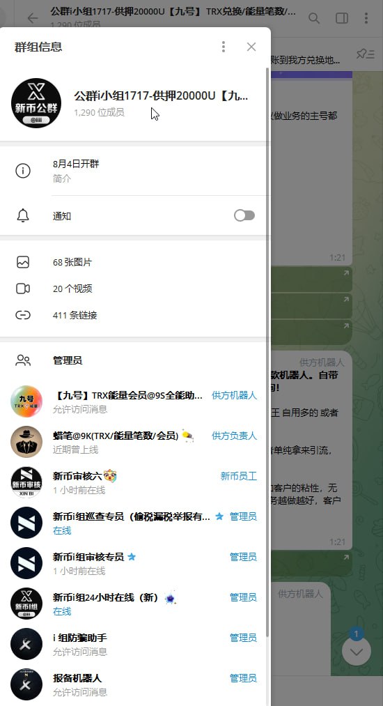 上周因操作失误在交换TRX机器人时误转了80000U,联系管理员后拒不认错,还擅自删除了对话记录,今日竟利用我转错的资金开通了新群组。