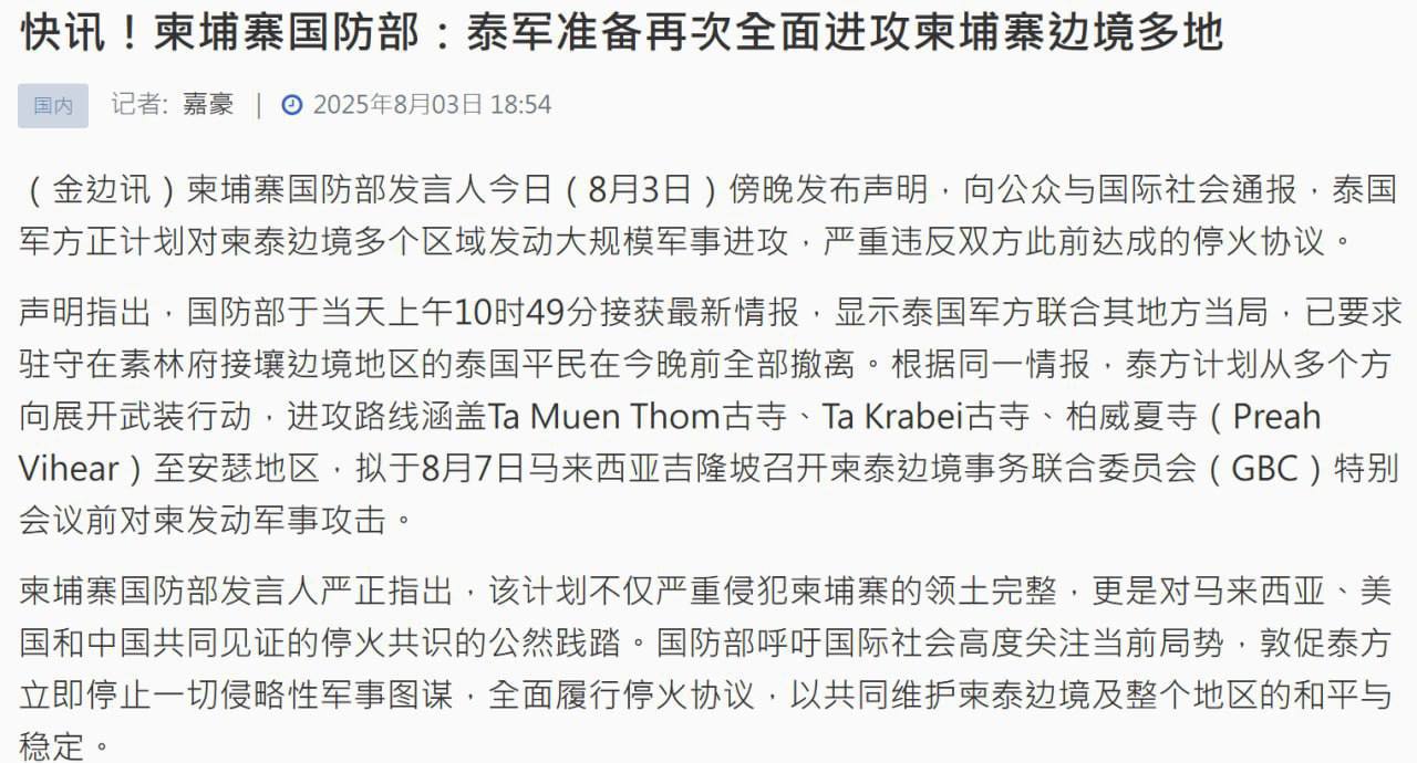 #用户投稿bugivugi (47)in #news • 8 months ago #用户投稿 #全网公开 #网民揭秘 #泰柬边境 #泰柬冲突 再次传出战争征兆,双方似乎又要开战。看来泰国可能发动对柬埔寨边境地区的攻势。 柬埔寨国防部声明:泰国似有意再次对柬埔寨发动攻击,边境地区或将出现新一轮撤离潮。 ────────── 点击关注世界TG华人揭秘社区🇨🇳 立即前往世界TG华人揭秘社区🇨🇳 点击进入群聊互动区域🇨🇳 需爆料或投放广告,请联系编辑