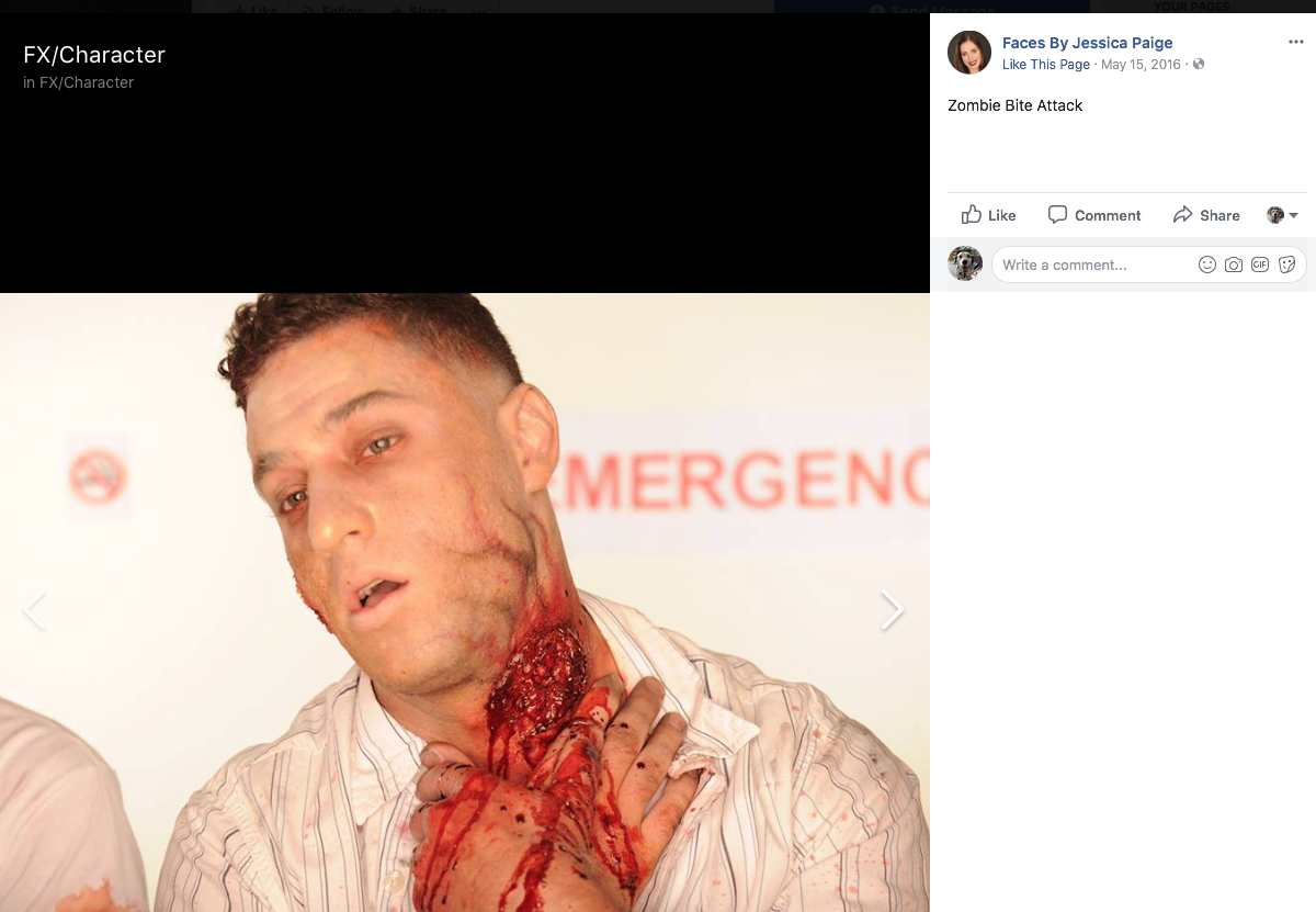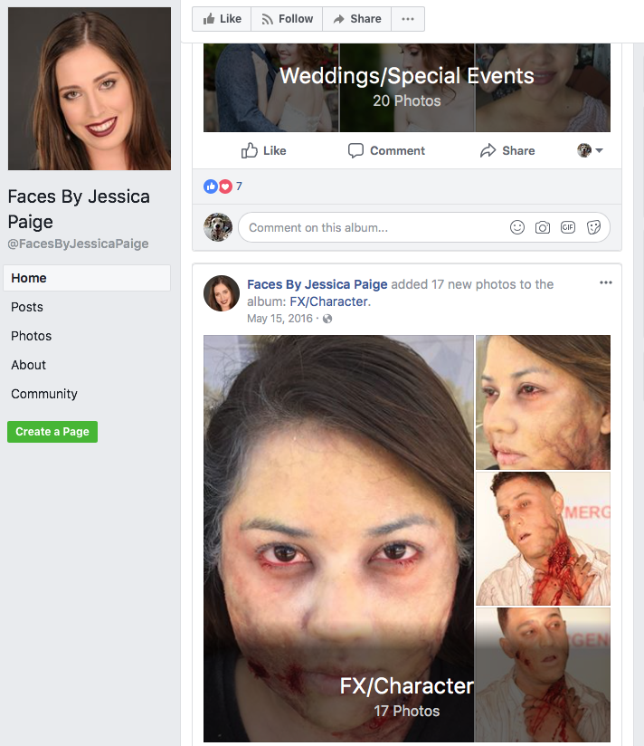 Screen cap of front page of account shows that Jessica Goodin is a special effects Make up artist at Universal Studios Florida and Faces By Jessica, as well as studying special effects make up at the Cosmix School of Makeup Artistry