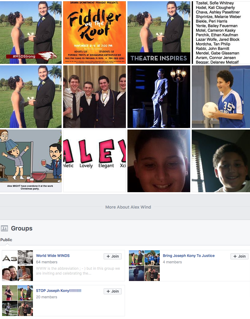 Now guess who helped head up the Kony2012/Invisible Children campaign for the US State Department? None other than Brennan Gilmore who was the main media personality/witness for the Charlottesville car incident in summer 2017. Thus, it is quite an interesting coincidence that these Kony2012 groups are the only groups (aside from a family genealogy group) on the Facebook page of Alex Wind, student actor and one of the lead media promoted personalities for the Parkland shooting event.