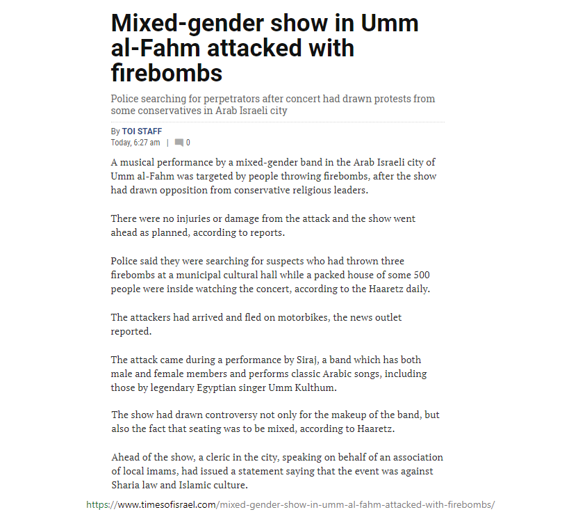 article: https://www.timesofisrael.com/mixed-gender-show-in-umm-al-fahm-attacked-with-firebombs/