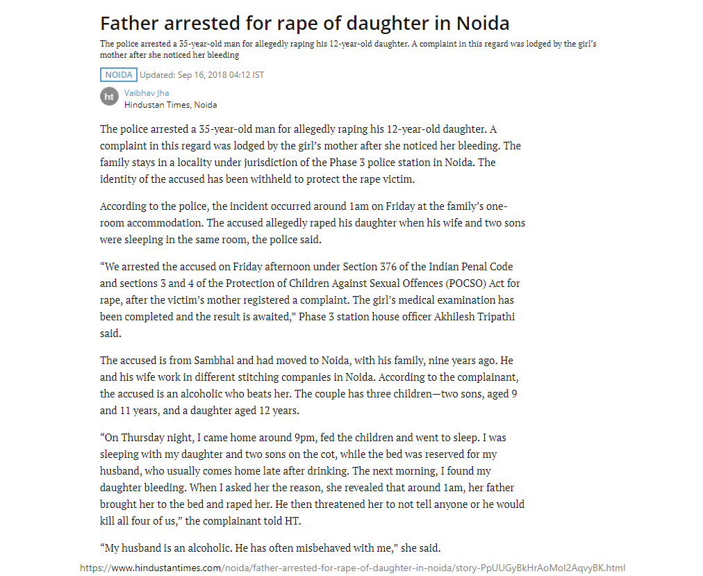 article: https://www.hindustantimes.com/noida/father-arrested-for-rape-of-daughter-in-noida/story-PpUUGyBkHrAoMoI2AqvyBK.html