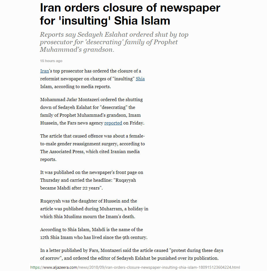 article: https://www.aljazeera.com/news/2018/09/iran-orders-closure-newspaper-insulting-shia-islam-180915123604224.html