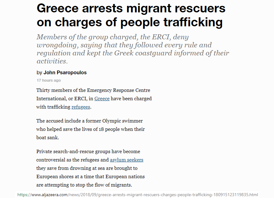 article: https://www.aljazeera.com/news/2018/09/greece-arrests-migrant-rescuers-charges-people-trafficking-180915123119835.html