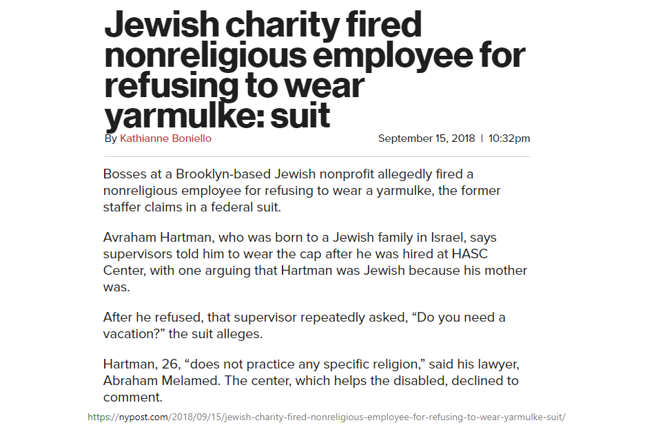 article: https://nypost.com/2018/09/15/jewish-charity-fired-nonreligious-employee-for-refusing-to-wear-yarmulke-suit/