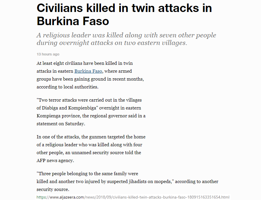 article: https://www.aljazeera.com/news/2018/09/civilians-killed-twin-attacks-burkina-faso-180915163351654.html