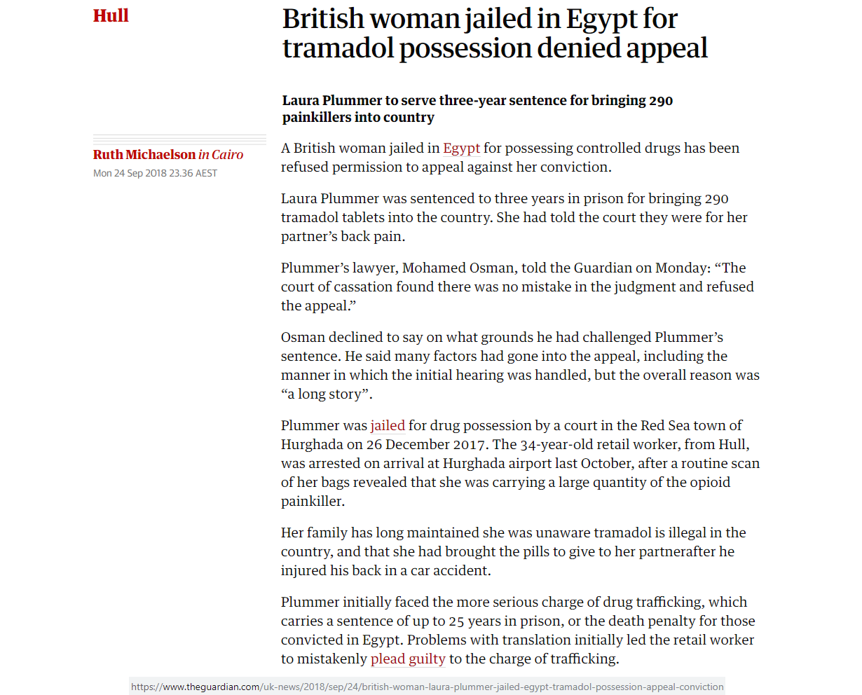article: https://www.theguardian.com/uk-news/2018/sep/24/british-woman-laura-plummer-jailed-egypt-tramadol-possession-appeal-conviction