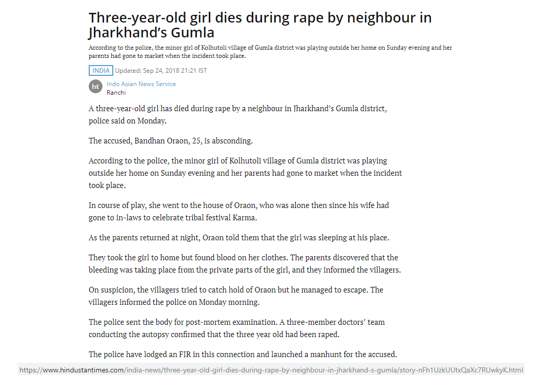 article: https://www.hindustantimes.com/india-news/three-year-old-girl-dies-during-rape-by-neighbour-in-jharkhand-s-gumla/story-nFh1UzkUUtxQaXc7RUwkyK.html