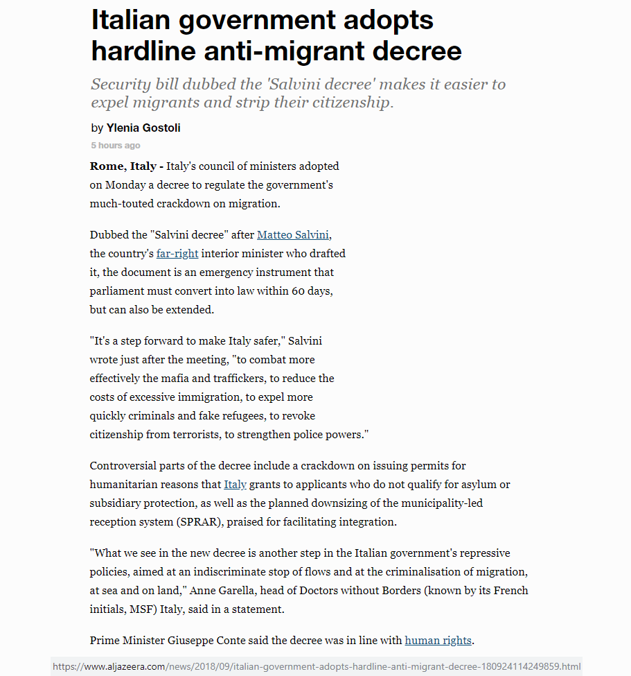 article: https://www.aljazeera.com/news/2018/09/italian-government-adopts-hardline-anti-migrant-decree-180924114249859.html