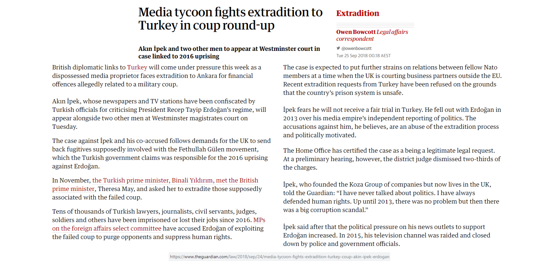 article: https://www.theguardian.com/law/2018/sep/24/media-tycoon-fights-extradition-turkey-coup-akin-ipek-erdogan