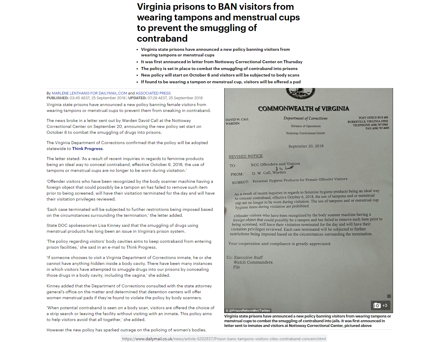 article: https://www.dailymail.co.uk/news/article-6202837/Prison-bans-tampons-visitors-cites-contraband-concern.html