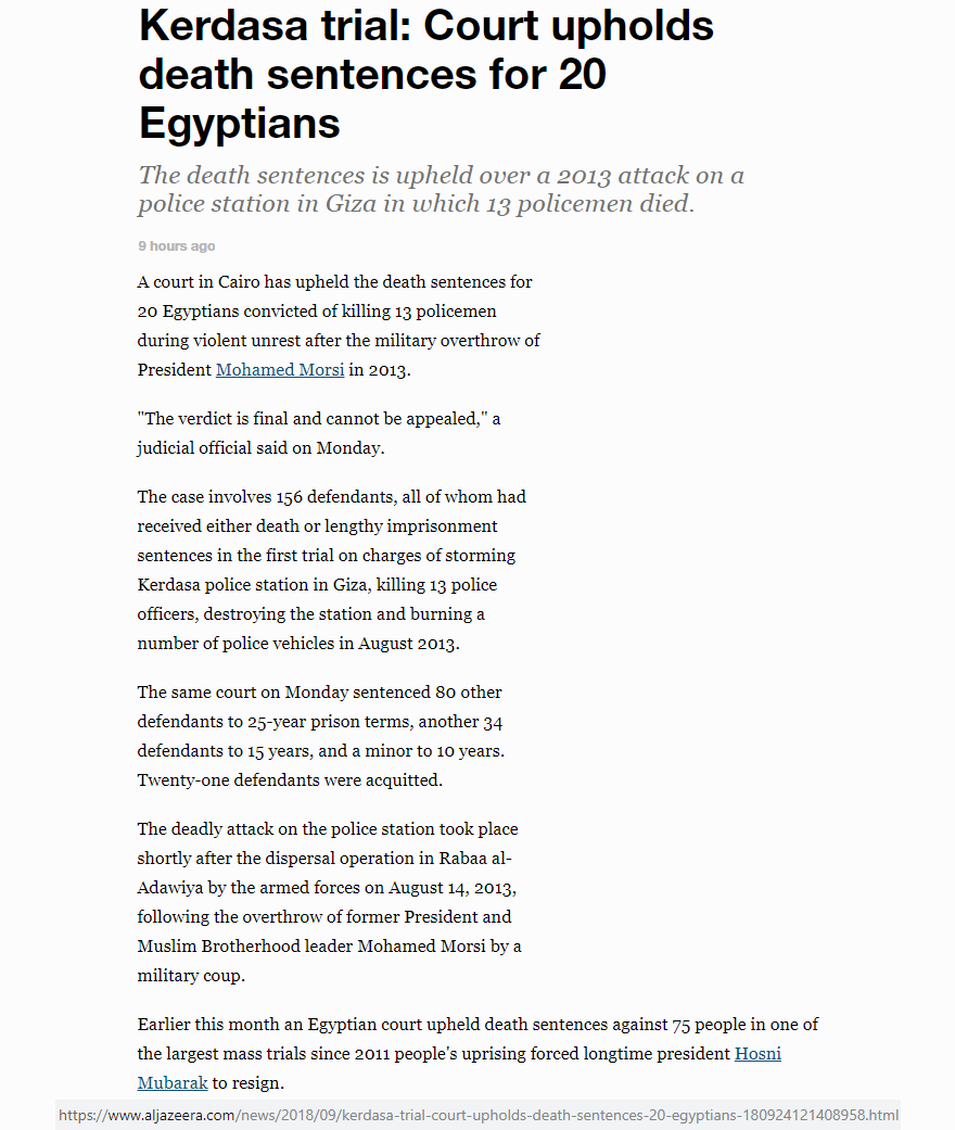 article: https://www.aljazeera.com/news/2018/09/kerdasa-trial-court-upholds-death-sentences-20-egyptians-180924121408958.html