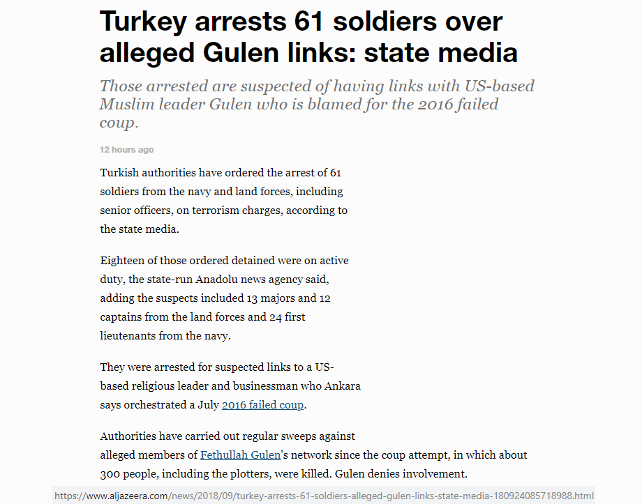 article: https://www.aljazeera.com/news/2018/09/turkey-arrests-61-soldiers-alleged-gulen-links-state-media-180924085718988.html