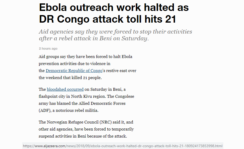 article: https://www.aljazeera.com/news/2018/09/ebola-outreach-work-halted-dr-congo-attack-toll-hits-21-180924173853998.html