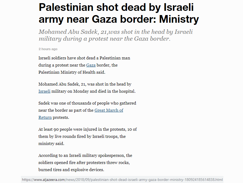 article: https://www.aljazeera.com/news/2018/09/palestinian-shot-dead-israeli-army-gaza-border-ministry-180924185614838.html