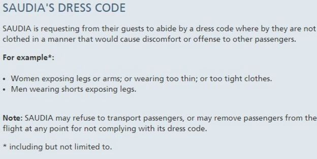 Details of the dress code featured on Saudia Airlines website show that the airline requires guests to dress in a way that does not 'cause offense or discomfort to other passengers'.