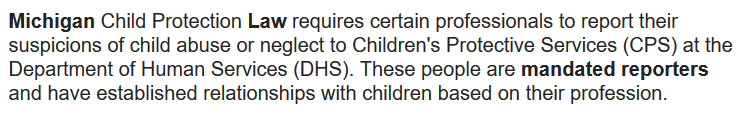 Very informative post about the mandatory reporters. Child abusing is an alarming social problem that has to be rectified asap. This post will help the residents of Michigan a lot. I think this social awarness post needs more views, if you can, plz share it to other platforms like facebook, twitter too so that more people can read it.