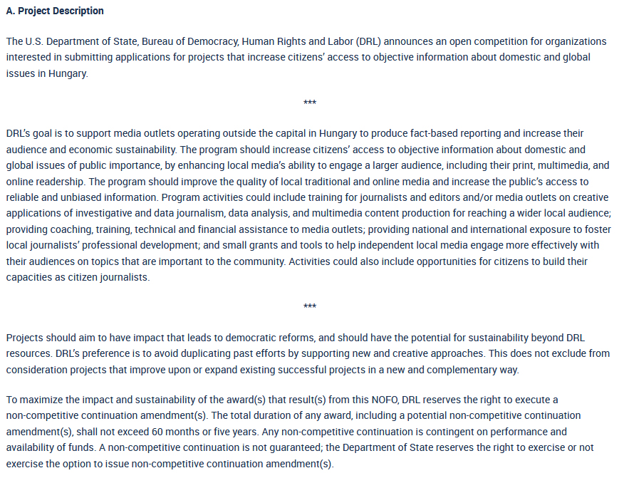 Bureau of Democracy, Human Rights and Labor (DRL) Notice of Funding Opportunity (NOFO): Supporting Objective Media in Hungary | State.gov - 11/07/2017