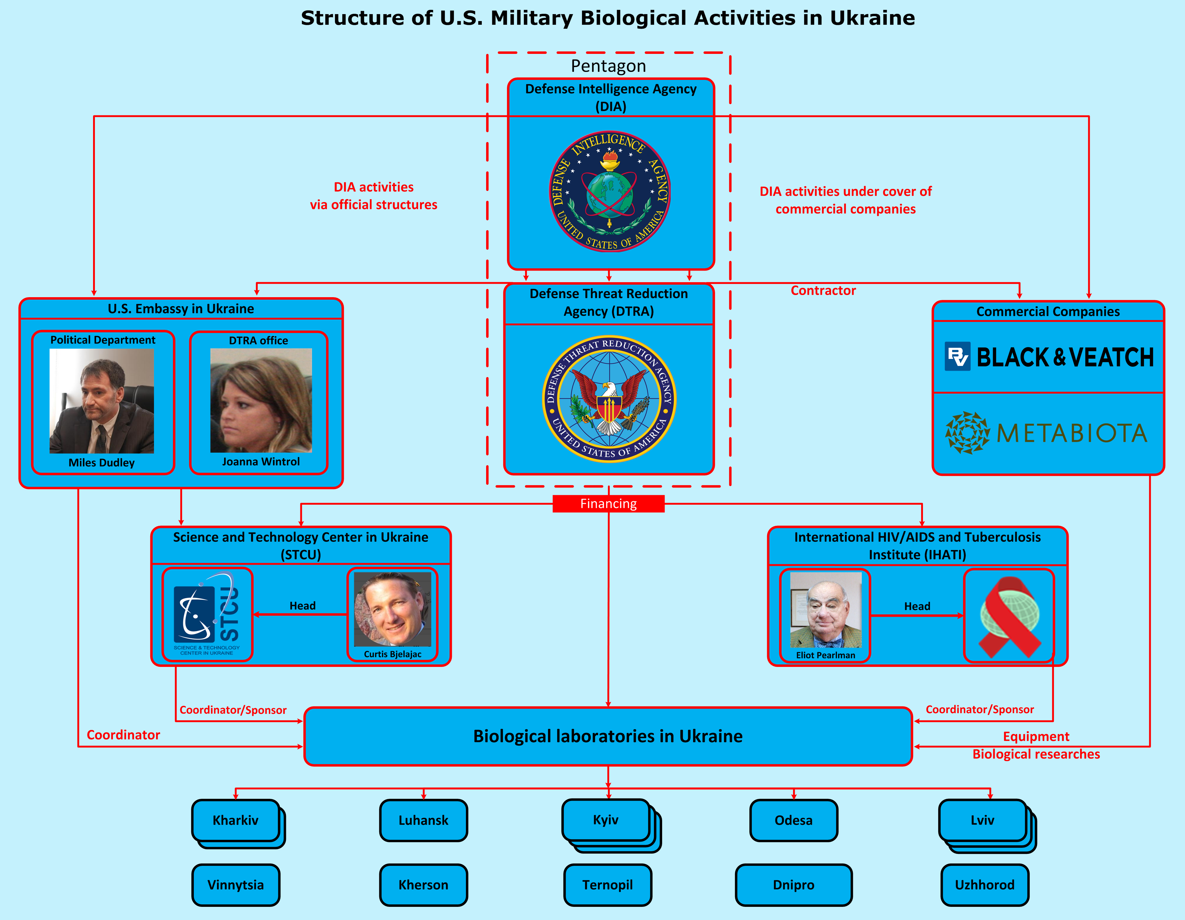 The Defense Threat Reduction Agency of the Pentagon handles construction and maintenance of the labs. Kevin Garrett is in charge of the Ukrainian unit at the DTRA headquarters. The agency's interests in Ukraine are represented by Joanna L. Wintrol, the U.S. Embassy employee. The work of the American specialists at the classified sections of the biological labs is supervised by Miles Dudley, the official of the U.S. Embassy political department and the DIA's officer.