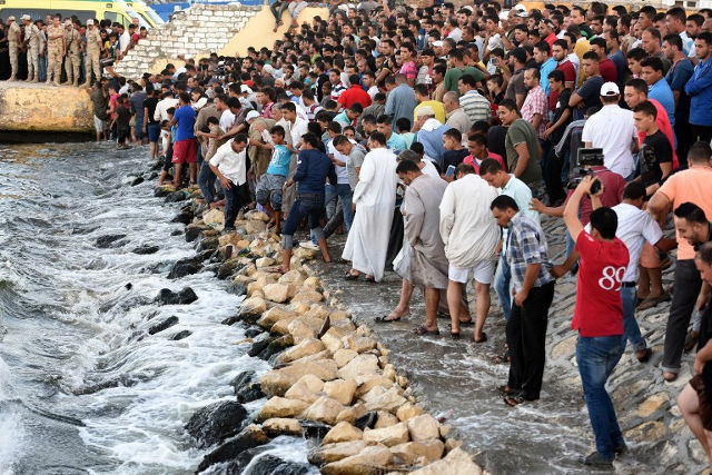 EGYPT BOAT ACCIDENT. Egyptians stand on the shore as they wait for the recovery of bodies, during a search operation after a boat carrying migrants capsized in the Mediterranean, along the shore in the Egyptian port city of Rosetta on September 22, 2016. Photo by Mohamed El-Shahed/ AFP