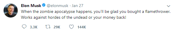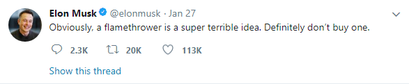 Boring company sold the flamethrower (Why are we not calling it a weapon??) for $500 each. Elon Musk been regularly tweeting about the sales tweeted that, out of 20,000 items 7000 were sold, the sales crossed 10,000 later that day. Sales went upto 15,000 item this tuesday. Nice marketing Musk, Nice Marketing.