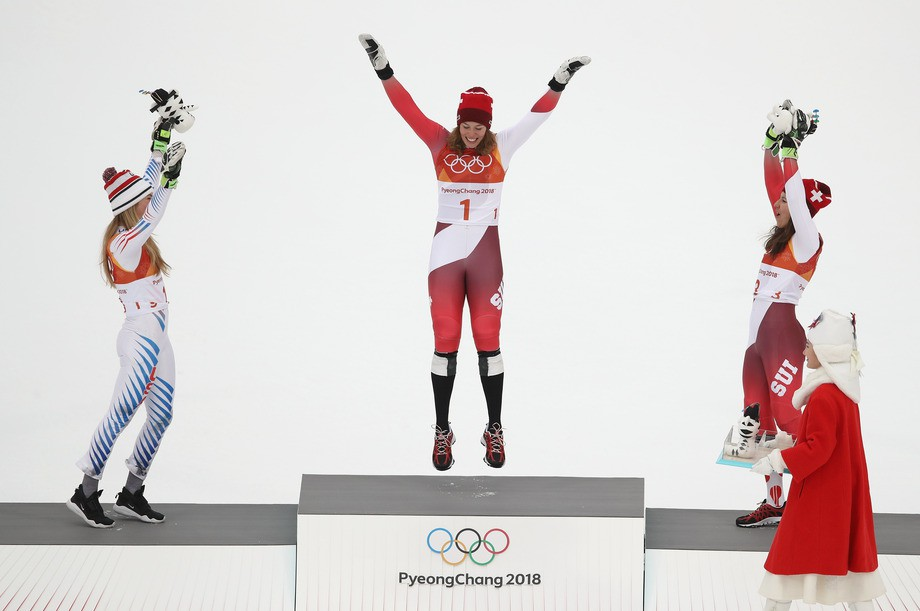 Skiers Mikaela Schiffrin and Wendy Holderer congratulate Michel Gizin on winning the super combination.