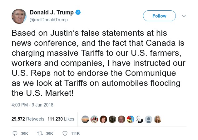 Canadian PM, desperadically correct Funnysocks Crazyhandshake has enraged POTUS with his media conference, just after he turned his back to head off and see his beloved Kim… So he promised a revenge! He was so angry that he couldn’t put everything in one tweet, and had to threaten in another: