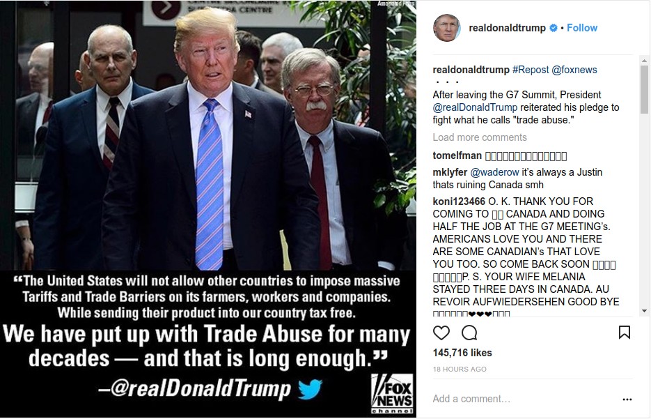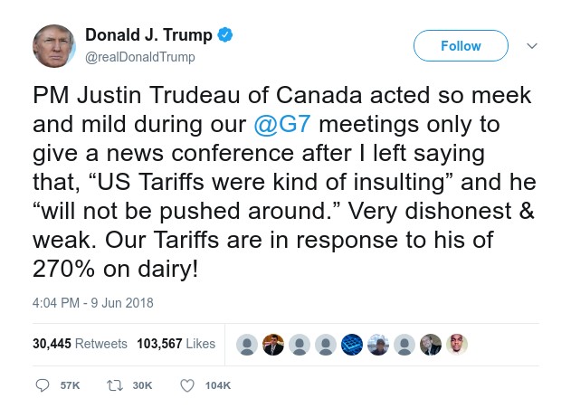 “POTUS is not going to let a Canadian prime minister push him around on the eve of this summit [with Kim] … Trump is not going to permit any show of weakness on a trip to negotiate with North Korea. Kim must not see American weakness.”