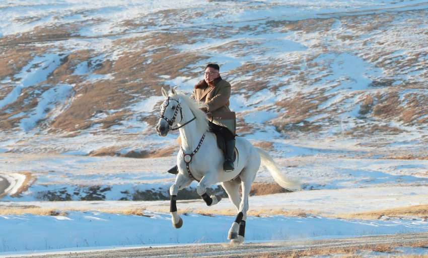 在朝鲜中央通讯社(KCNA)发布的照片中,可以看到金正恩独自骑着一匹巨大的白马,在白头山的雪地和森林中穿行。白头山是金氏王朝的精神家园。