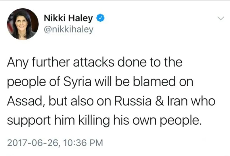 Now to make the situation much worse the UN ambassador to Donald Trump, Nikki Haley just tweeted this, “that any further actions done to the people of Syria will be blamed on Assad, but also on Russia and Iran who support him killing his own people.”