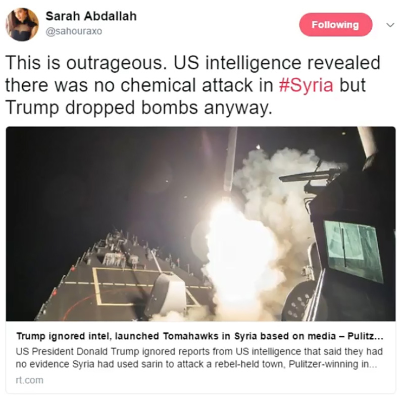 Meanwhile that chemical weapon attack that Trump is using in his statement, to justify the future plans for an attack against Syria, Russia, China, and Iran was never investigated by the United States. They never even waited to find out exactly what really happened. They launched bombs anyway. Previously even the United Nations accused the Syrian rebels and radical Islamic terrorists that are fighting against the Syrian government of using chemical weapons.