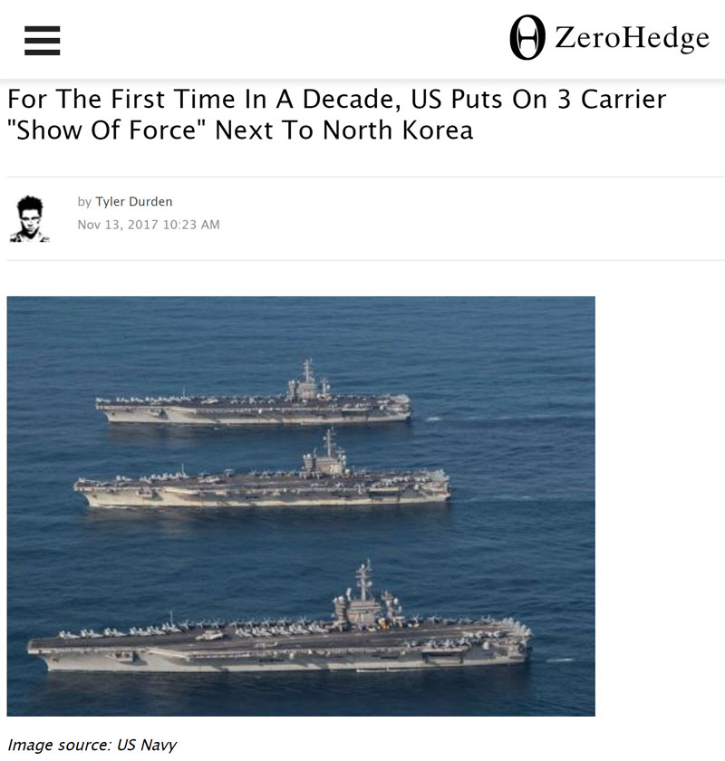 In other bankrupting this country news, we have a large show of force by the US military that for the first time in a decade has placed three US aircraft carriers right next to North Korea. This is an ongoing saber-rattling show of force between the United States and North Korea. I don't see this going anywhere especially since China declared that they would intervene and stop America if it attacks North Korea. They say they will only stay neutral if North Korea attacks the United States first.