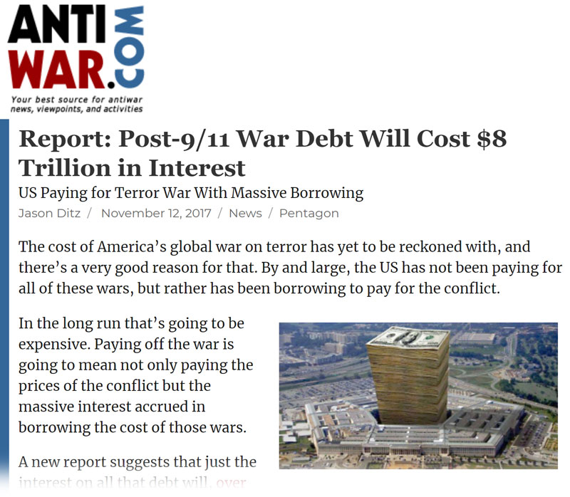 In other horrible financial misuses of money news, there's a new report documenting how the war on terror has cost 8 trillion dollars in interest alone as the United States has been borrowing money to pay for more empire building. You know the usual, war, destruction, drones, arming terrorists, and other horrible things. With Donald Trump's aggressive foreign policy and expanding military budgets, we can expect more debt and servitude. The interest will only get higher.