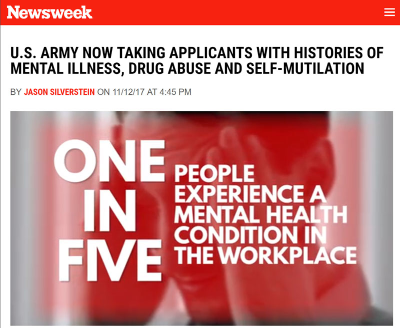 The never-ending saga of more dumbass moves by the military-industrial complex continues. We are getting news now that the US Army will be taking applicants with histories of mental illness, drug abuse, and self-mutilation. This mainly because of low army signups. The military is struggling to meet Donald Trump's goal of recruiting 80,000 new soldiers. I don't know about you, but I think taking in people that have mental issues and previous drug abuse issues and training them to be professional killers is not a good idea.