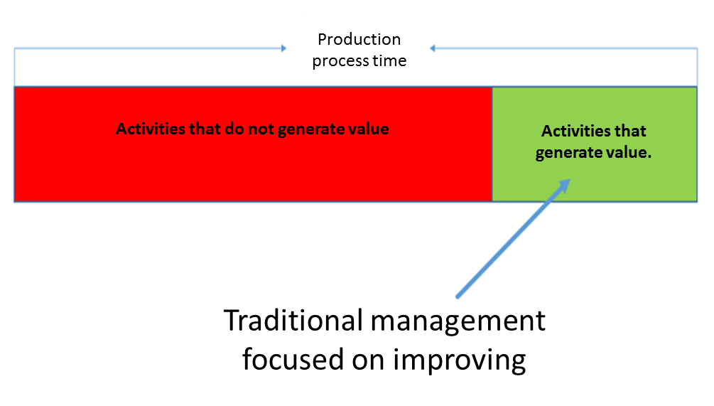 Traditional management seeks to improve its production times and maximize profits by improving its activities that add value to the process. However, as we see in the following image, and is the determinant factor in the study done, the greatest amount of time in the production process is occupied by activities that do not generate value. Well, the Japanese saw this phenomenon and "EUREKA", developed management tools that allow do it.