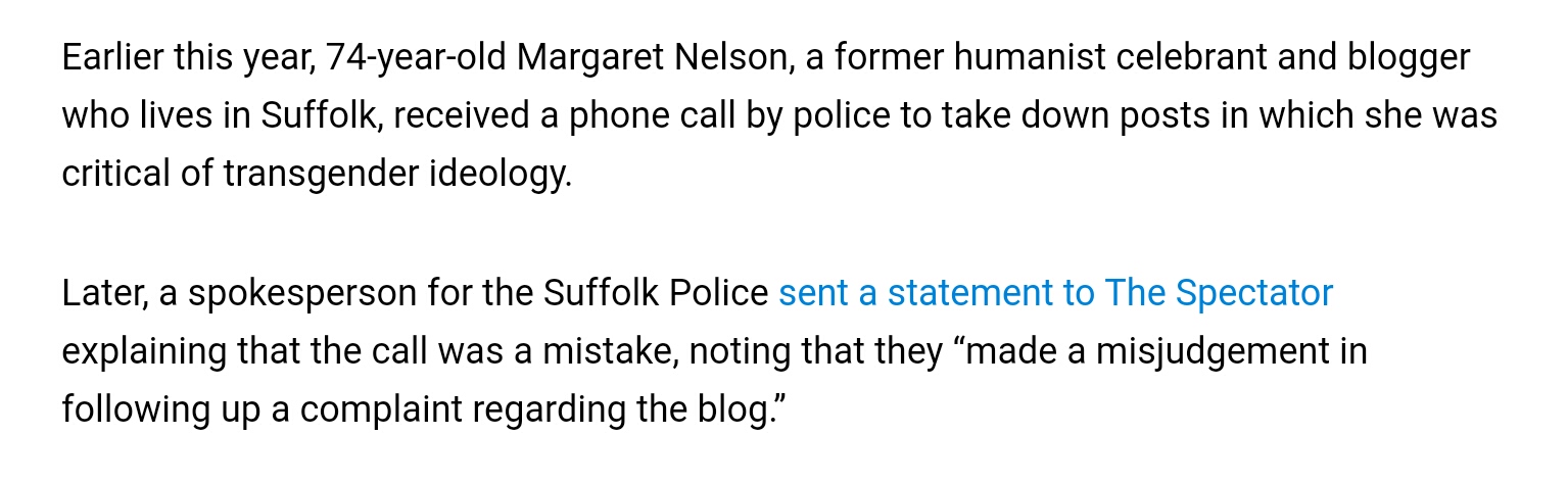 One might also say its unlikely that anyone would report someone unless they really were harassing them and not for a one off slip up. Sadly there are no guarantees to that and the fear is already there anyway, because news sources tend to boil it down to the basics and it becomes as simple as “UK mom arrested for calling a transgender activist a man,” something I actually discussed in my last post, about not having enough information to get a full picture.
