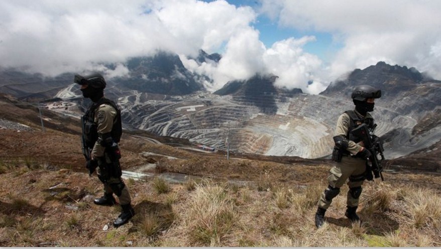 petugas dari satuan brimobda diy satgas amole iii 2015 bko pt freeport indonesia berjaga di area tambang terbuka pt freeport indonesia di timika, papua, sabtu (19/9). satgas amole iii bertugas guna menjaga wiayah pertambangan freeport dari berbagai gangguan. antara foto/muhammad adimaja/nz/15