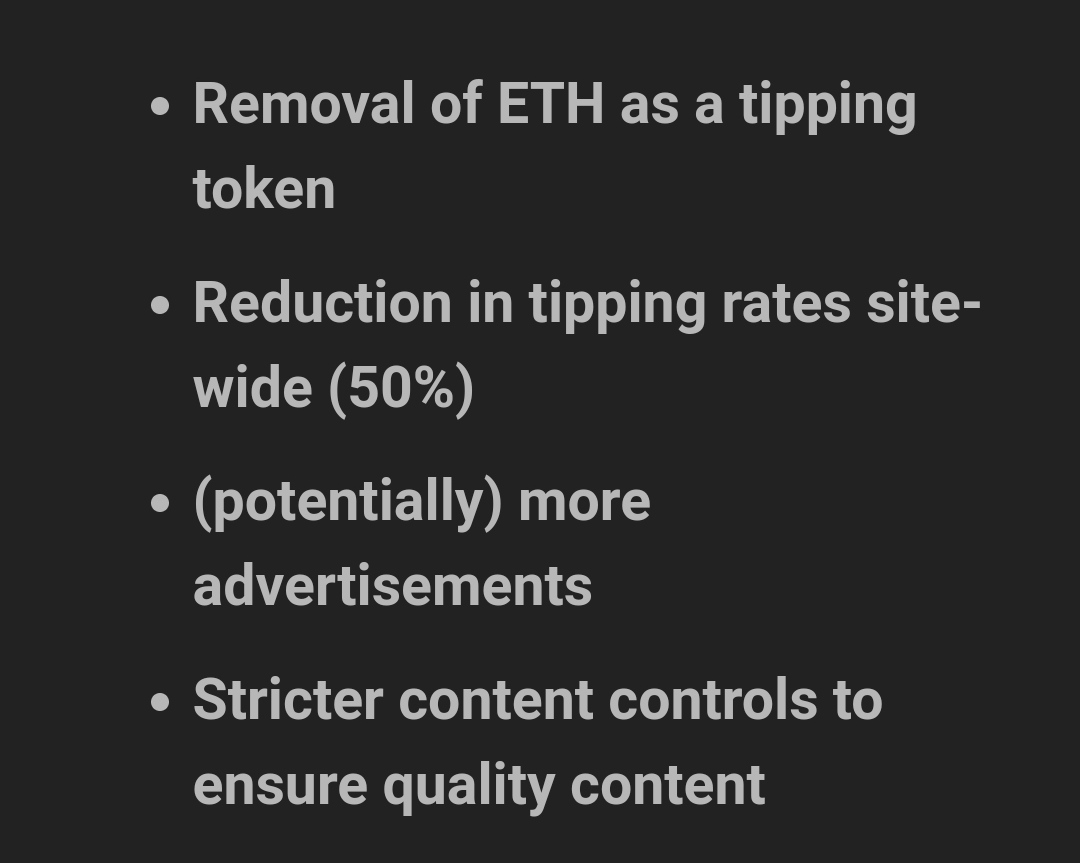 Publish0x has announced some drastic changes on the platform. First of all all tips are cut by 50% from now on. Secondly, they are removing ETH from tips. You can withdraw your ETH until June 28, otherwise it will be converted to AMPL using the price of that day. But they are open to suggestions for adding a new coin.Finally they decided to have more ads on the website and fight harder low quality content.