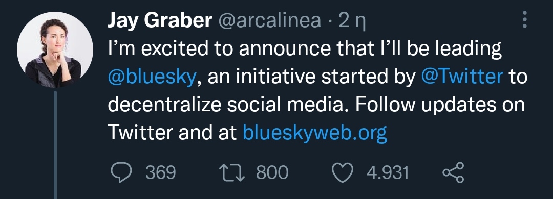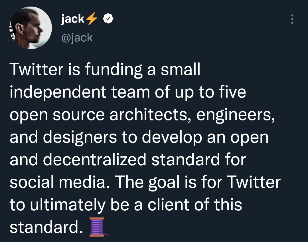 As I have said, there can never be a truly decentralised social media network or any kind of DeFi or financial platform. There are many different reasons but will talk about it another time. BTW, first Jack said that Blue Sky was the name of the team and the goal was to make Twitter itself decentralised. But it seems now that it will be a separate project. "For different reasons " Twitter became centralised Jack said. I guess the VC companies wouldn't fund him with hundreds of millions if it was decentralised.
